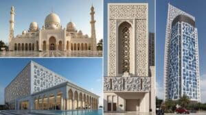 - Arabesque screens, geometric jali panels, calligraphy elements, minaret cladding, and muqarnas details.